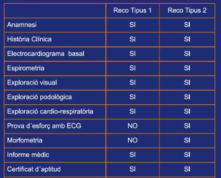 SPORTIU BÀSIC (MDB): Orientat a esport escolar o llicència federativa Valoració general. Electrocardiograma. Examen articular i muscular. Composició corporal- Percentatge de greix. Estudi nutricional i dieta.